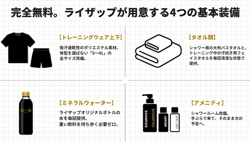 | タオル類 | ライザップが用意 | 清潔なものが提供されます。 |